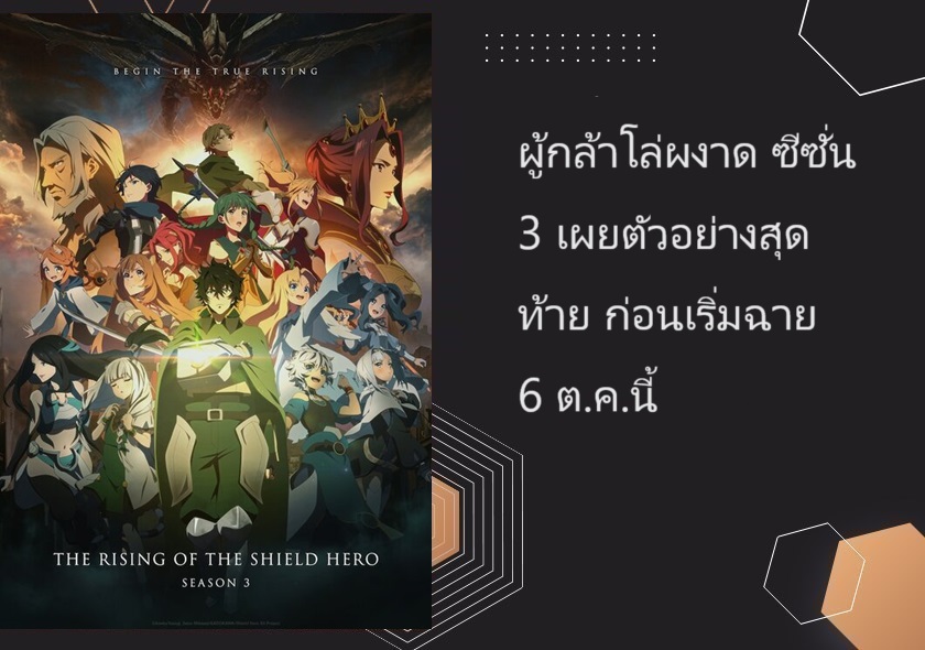 ทวิตเตอร์ทางการของอนิเมะ ผู้กล้าโล่ผงาด (Tate no Yuusha no Nariagari) ได้เผยตัวอย่างสุดท้ายของซีซั่น 3 ก่อนที่จะเริ่มออกอากาศตอนแรกในวันที่ 6 ตุลาคมนี้ออกมาแล้ว