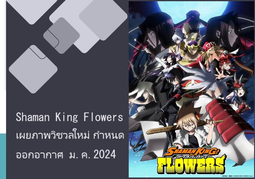 ทวิตเตอร์ทางการของอนิเมะ Shaman King Flowers (ชาแมนคิง ฟลาวเวอร์) ภาคต่อของ Shaman King (ราชันย์แห่งภูต) ได้เผยภาพวิชวลใหม่ และกำหนดการออกอากาศออกมาแล้ว