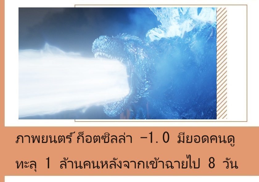 ภาพยนตร์ Godzilla -1.0 (ก็อตซิลล่า ไมนัส วัน) มียอดผู้เข้าชมทะลุ 1 ล้านคนภายในระยะเวลา 8 วัน (วันที่ 10 พฤศจิกายน) หลังจากที่เข้าฉายไปเมื่อวันที่ 3 พฤศจิกายนที่ผ่านมา