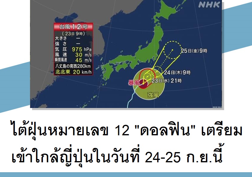 ไต้ฝุ่นหมายเลข 12 ดอลฟิน เตรียมเข้าใกล้ญี่ปุ่นในวันที่ 24-25 ก.ย.นี้
