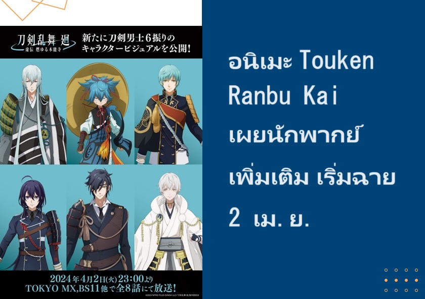 อนิเมะ Touken Ranbu Kai: Kyoden Moyuru Honnouji มีกำหนดเริ่มออกอากาศในวันที่ 2 เมษายนนี้ โดยจะมีด้วยกันทั้งหมด 8 ตอน