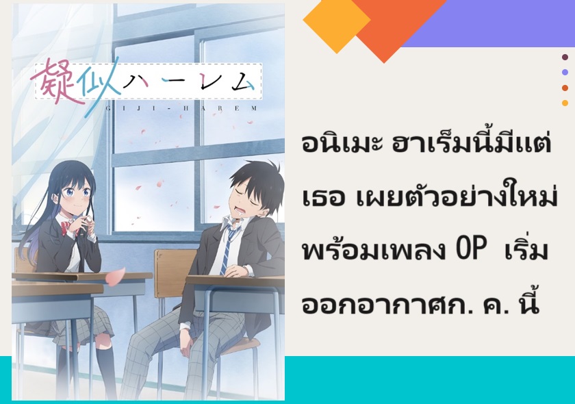 ทวิตเตอร์ทางการของอนิเมะ ฮาเร็มนี้มีแต่เธอ (Giji Harem) ได้เผยตัวอย่างใหม่ที่มาพร้อมกับเพลง OP ออกมาให้ชมกันแล้ว
