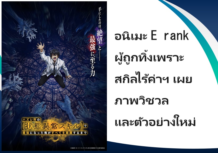 Pony Canyon ได้เผยภาพวิชวลและตัวอย่างใหม่ของอนิเมะ E rank ผู้ถูกทิ้งเพราะสกิลไร้ค่าอย่าง [สร้างสถานะผิดปกติ] จะเหยียบย่ำทุกสิ่งที่ขวางทางจนแกร่งสุดในใต้หล้า (Hazurewaku no [Joutai Ijou Skill] de Saikyou ni Natta Ore ga Subete wo Juurin suru made) ออกมาให้ชมแล้ว