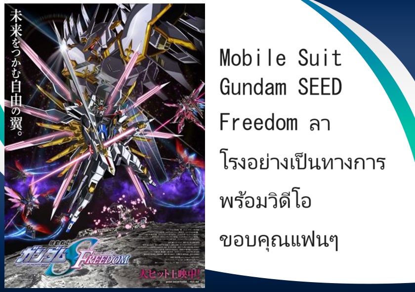 ภาพยนตร์อนิเมะ Mobile Suit Gundam SEED Freedom (โมบิลสูท กันดั้ม ซี้ด ฟรีด้อม) ได้ลาโรงภาพยนตร์ที่ญี่ปุ่นอย่างเป็นทางการแล้วเมื่อวันที่ 23 พฤษภาคมที่ผ่านมา