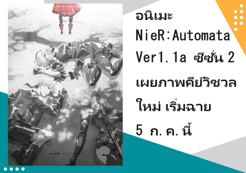 Aniplex ได้เผยภาพคีย์วิชวลใหม่ของอนิเมะ NieR:Automata Ver1.1a ซีซั่น 2 ที่เป็นภาพของ 3 ตัวละครหลัก ได้แก่ 2B, 9S และ A2 ออกมาให้รับชมกันแล้ว