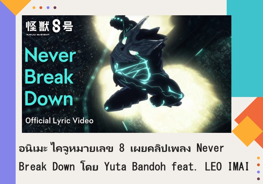 TOHO animation ได้เผยคลิปเพลง "Never Break Down" ที่ร้องโดย Yuta Bandoh feat. LEO IMAI ที่ใช้ประกอบในอนิเมะ ไคจูหมายเลข 8 (Kaiju No.8) ตอนที่ 10 ซึ่งออกอากาศไปเมื่อวันที่ 15 มิถุนายนที่ผ่านมา