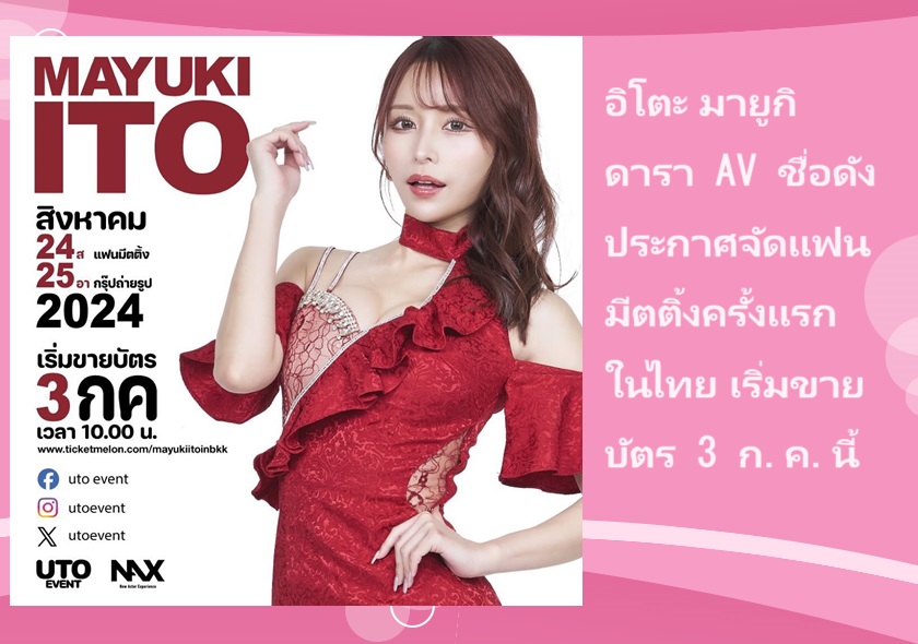 คุณอิโตะ มายูกิ (Ito Mayuki) ดารา AV อันดับ 1 จากค่าย Kawaii วัย 26 ปี ได้โพสต์อินสตาแกรม ประกาศจัดงานแฟนมีตติ้งครั้งแรกในไทย "Mayuki Ito 1st Fan Meeting in Bangkok" พร้อมเผยรายละเอียดของงานออกมาแล้ว