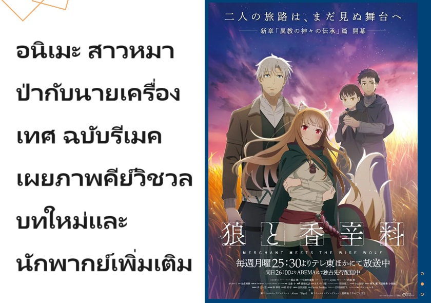อนิเมะ สาวหมาป่ากับนายเครื่องเทศ ฉบับรีเมค เริ่มออกอากาศตั้งแต่วันที่ 2 เมษายนที่ผ่าน โดยจะออกอากาศยาวต่อเนื่อง 2 คูร์ รวมจำนวนทั้งสิ้น 25 ตอน
