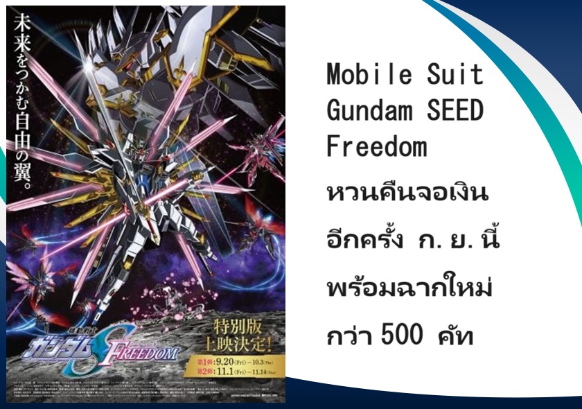 ภาพยนตร์อนิเมะ Mobile Suit Gundam SEED Freedom เตรียมกลับมาเข้าฉายในโรงภาพยนตร์ที่ญี่ปุ่นอีกครั้งในรูปแบบ Special Edition ที่มีการแก้ไขฉากเดิมให้ดียิ่งขึ้นกว่า 500 คัท และเพิ่มฉากจบแบบใหม่เข้ามา