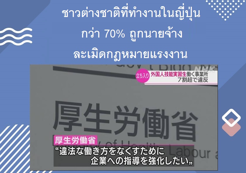 กระทรวงสาธารณสุข แรงงาน และสวัสดิการของญี่ปุ่น ระบุว่า ชาวต่างชาติที่ทำงานในญี่ปุ่นกว่า 70% ถูกนายจ้างละเมิดกฎหมายแรงงาน