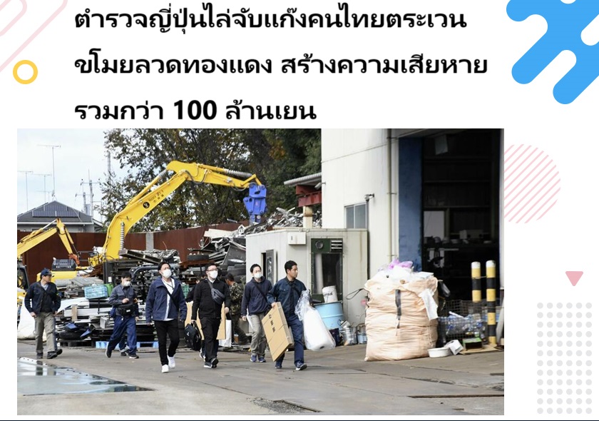 ตำรวจญี่ปุ่นไล่จับแก๊งคนไทยตระเวนขโมยลวดทองแดง สร้างความเสียหายรวมกว่า 100 ล้านเยน