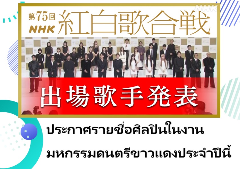 NHK ได้ประกาศรายชื่อศิลปินทั้งหมด 41 ท่านที่จะมาเข้าร่วมในงาน Kouhaku Uta Gassen ครั้งที่ 75 หรืองานมหกรรมดนตรีขาวแดงที่จัดขึ้นเป็นประจำทุกสิ้นปีออกมาแล้ว