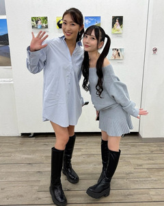 "วันนี้พี่สาวคนเก่งจากค่ายเดียวกัน คุณโคบายาคาวะ เรโกะ ก็มาเยี่ยมชมงานหลังจากทำงานเสร็จ แถมถึงตกใจเพราะสีเสื้อผ้ากับรองเท้าของเราคล้ายกันมาก…! 555"