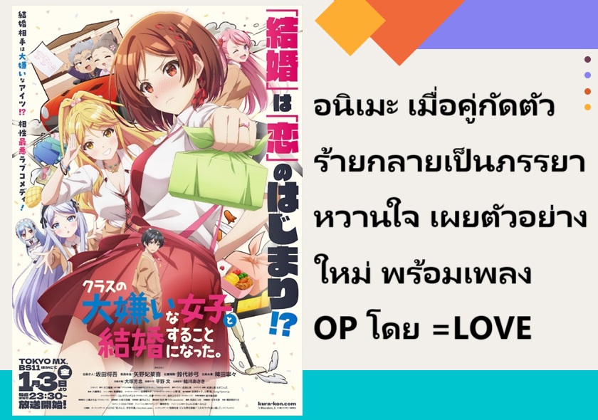 อนิเมะ เมื่อคู่กัดตัวร้ายกลายเป็นภรรยาหวานใจ (Kurasu no Daikiraina Joshi to Kekkon Suru Koto ni Natta) ได้เผยคีย์วิชวลและตัวอย่างใหม่ออกมาแล้ว