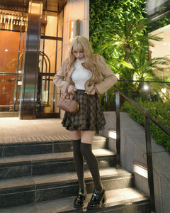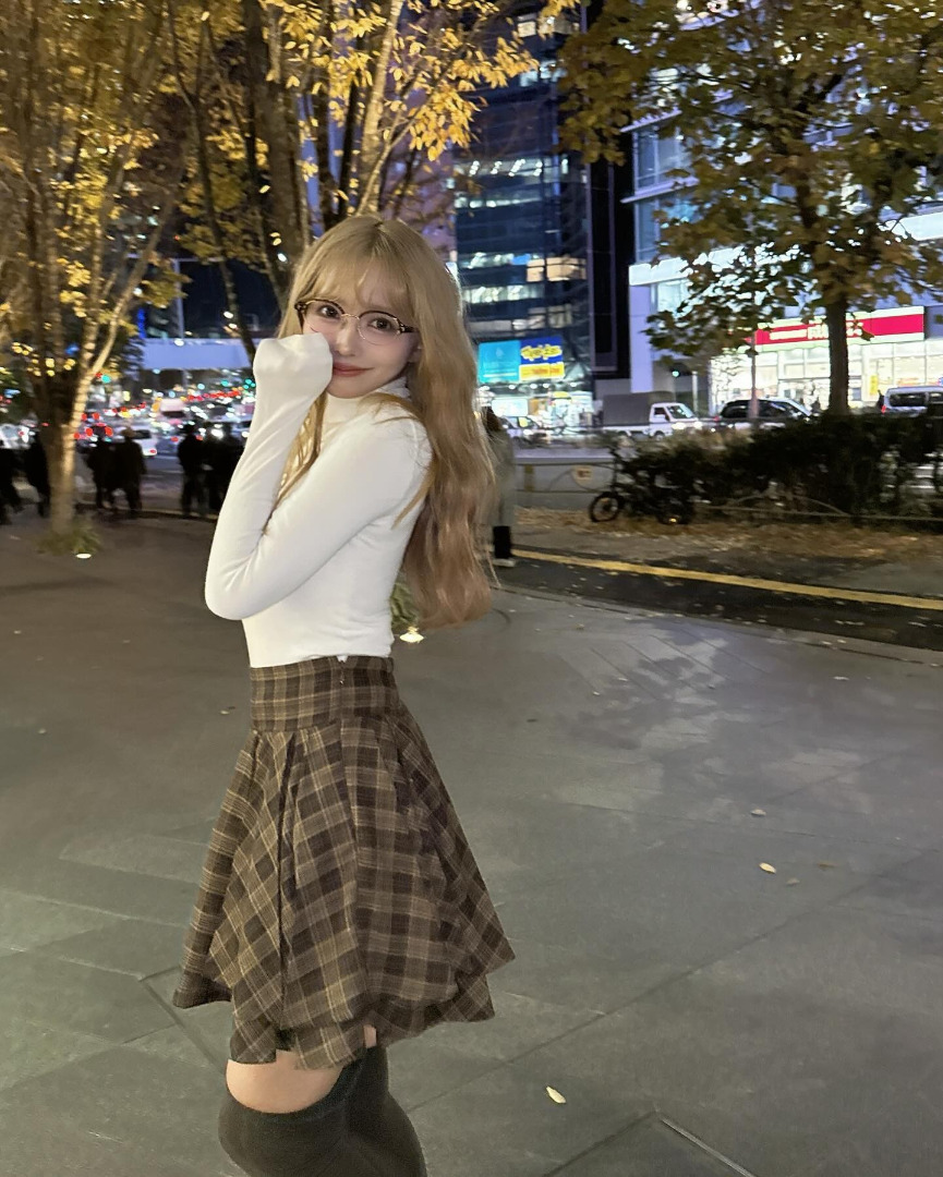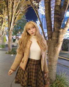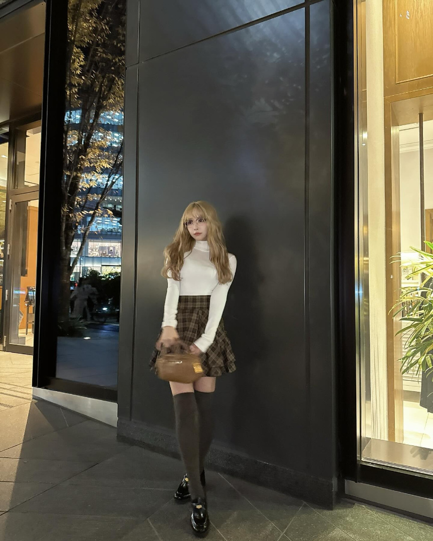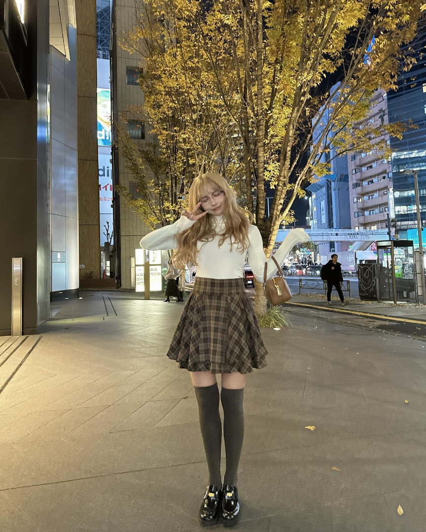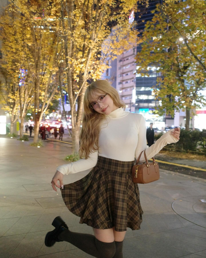 คุณมิคามิโพสต์ภาพโชว์กระโปรงลายสก็อตสีน้ำตาลอ่อนเข้ากับช่วงใบไม้เปลี่ยนสี พร้อมกับเขียนแคปชั่นดังนี้