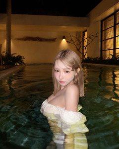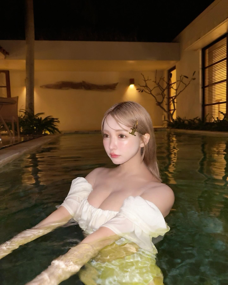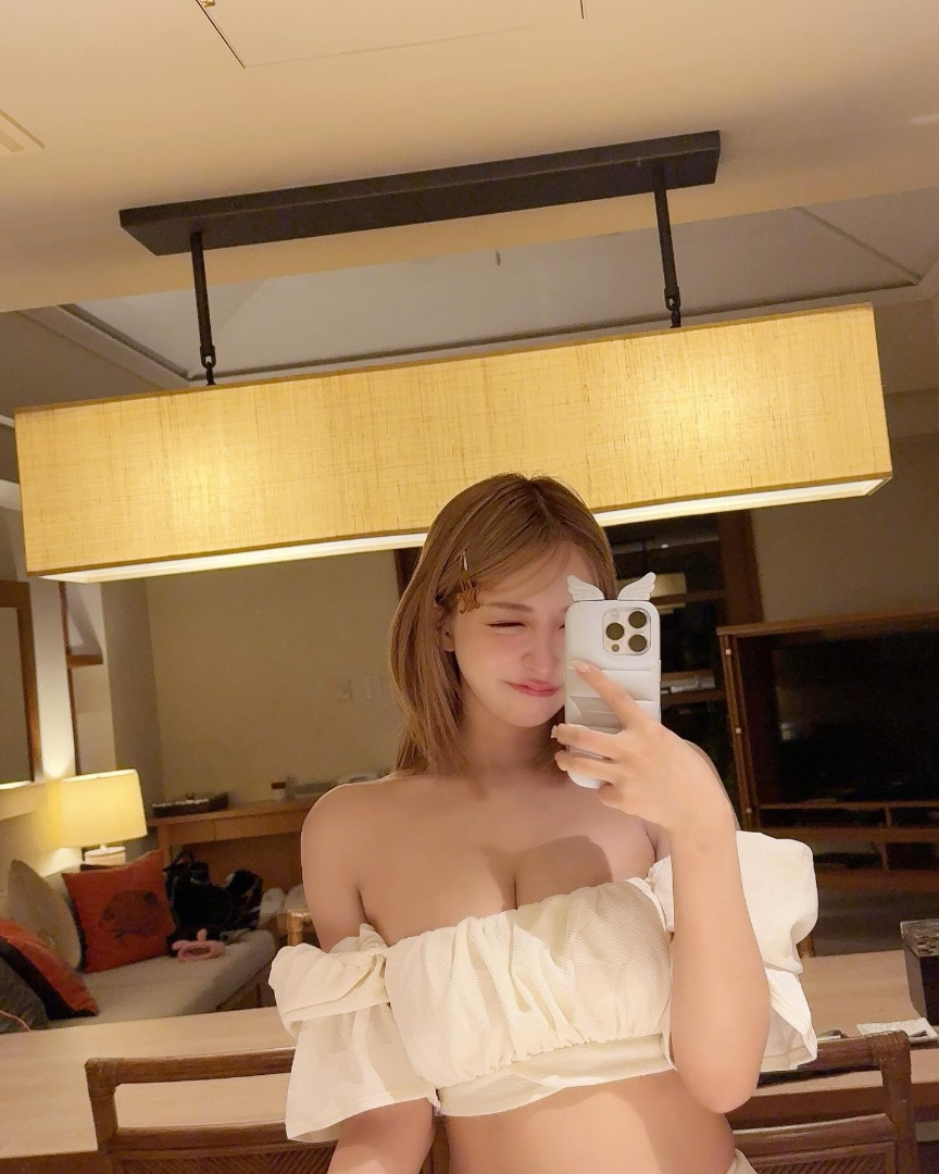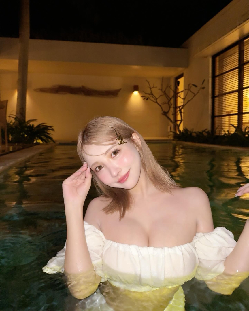 คุณมิคามิโพสต์ภาพ นุ่งชุดว่ายน้ำลงสระที่โรงแรมในระหว่างทริปท่องเที่ยวที่โอกินาว่า พร้อมแคปชั่นเป็นอิโมจิรูปหัวใจสีฟ้า