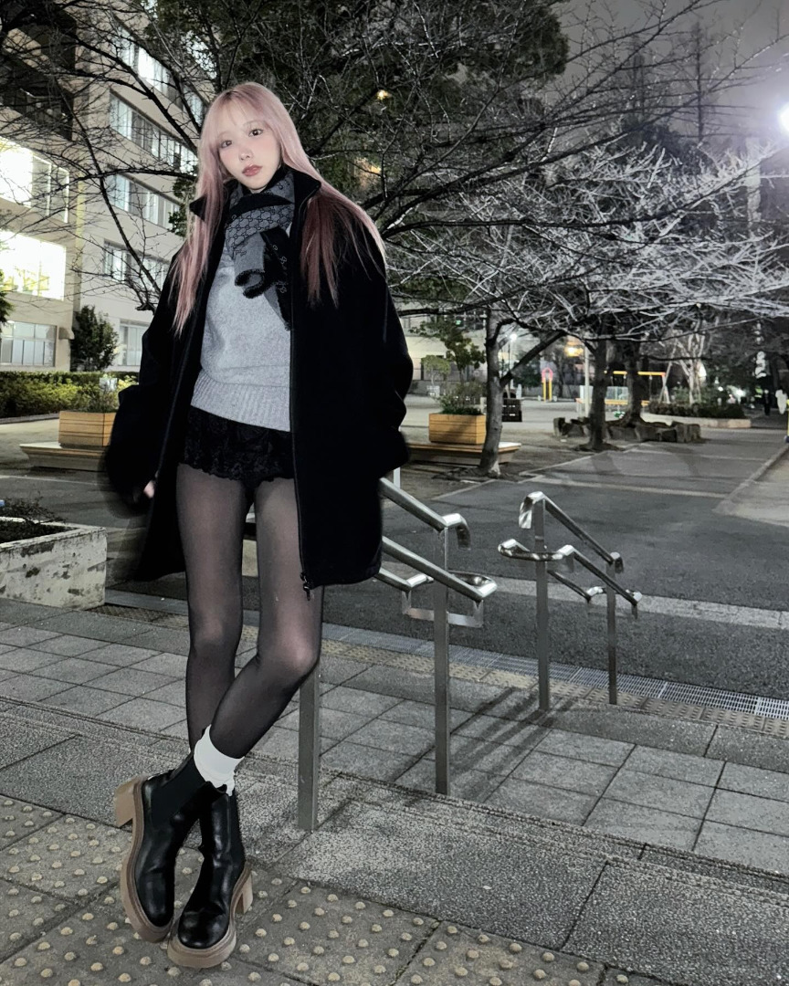 คุณโคโยอิโพสต์ภาพในชุดแฟชั่นฤดูหนาวที่ถ่ายกลางวิวยามค่ำคืน พร้อมแคปชั่นว่า "คลื่นความหนาวสุดติ่งมาก"