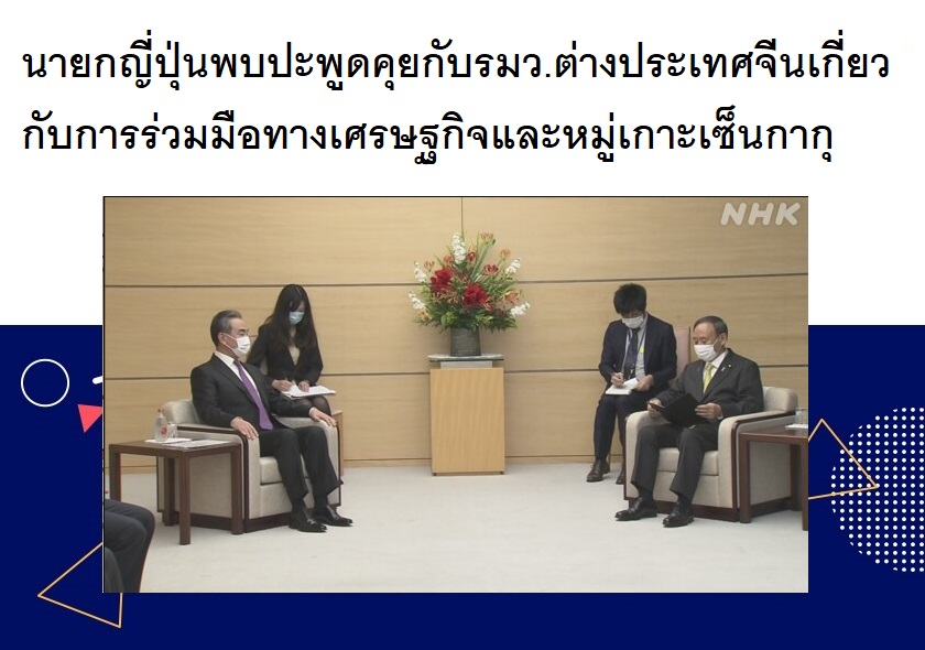 นายสึงะ โยชิฮิเดะ นายกรัฐมนตรีญี่ปุ่นได้พบปะพูดคุยกับนายนายหวัง อี้ รัฐมนตรีว่าการกระทรวงการต่างประเทศของจีนเมื่อวันที่ 25 พฤศจิกายน โดยนายสึงะได้แสดงความตั้งใจที่จะร่วมมือทางด้านเศรษฐกิจกับจีนให้มีความแน่นแฟ้นยิ่งขึ้นเพื่อพัฒนาสัมพันธไมตรีระหว่างสองประเทศ รวมถึงต้องการให้จีนดำเนินมาตรการเชิงบวกเกี่ยวกับกรณีพิพาทหมู่เกาะเซนกากุในจังหวัดโอกินาว่า