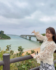 คุณฮาซึกิโพสต์ภาพที่ถ่ายตอนไปเที่ยวสะพานโคอุริในจังหวะดโอกินาว่า พร้อมเขียนแคปชั่นว่า "เกาะโคอุริ ทะเลสวย แค่ข้ามสะพานก็ตื่นเต้นแล้ว"