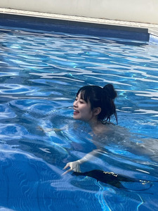 "น้ำในสระเย็นสดชื่นมากเลย!! นี่เป็นภาพเบื้องหลังการถ่ายแบบนะคะ!!"