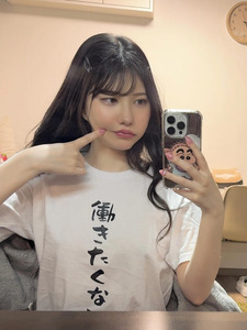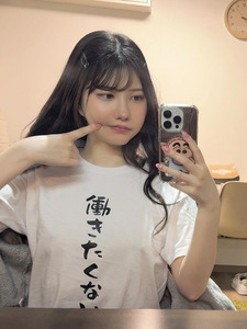 คุณไอกะโพสต์ภาพถ่ายหน้ากระจก พร้อมแคปชั่นว่า "วันนี้ใส่เสื้อยืดที่เขียนว่า "ไม่อยากทำงานเลย" แบบโนบรามาทำงานค่ะ"