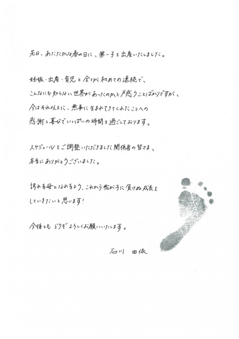 ล่าสุด เมื่อวันที่ 11 พฤษภาคมที่ผ่านมา คุณอิชิคาวะได้ประกาศข่าวดีผ่านทาง X (ทวิตเตอร์) ว่า เธอได้คลอดลูกคนแรกแล้ว
