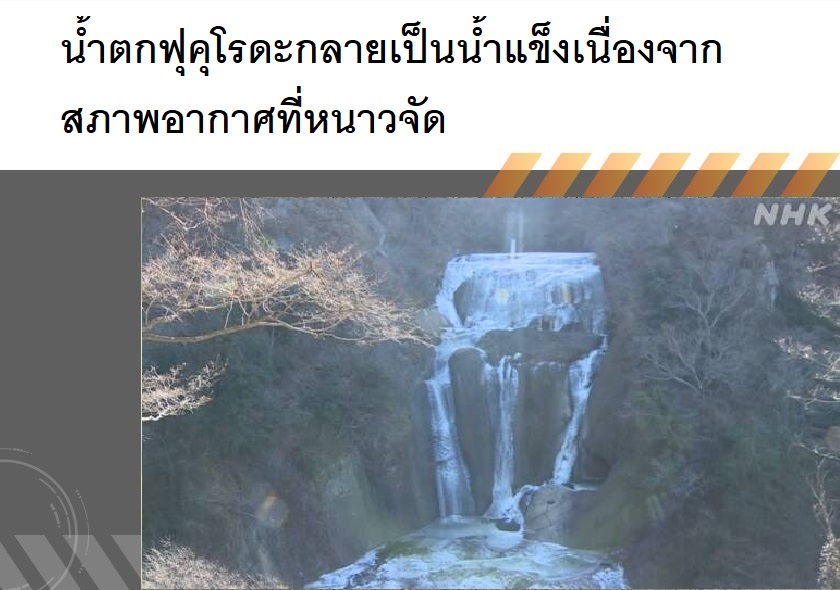 น้ำตกฟุคุโรดะ ซึ่งเป็นแหล่งท่องเที่ยวชื่อดังในเมืองไดโงะ จังหวัดอิบารากิ ได้กลายเป็นน้ำแข็งถึง 90% เนื่องจากสภาพอากาศที่หนาวเย็นอย่างต่อเนื่องทั่วประเทศญี่ปุ่น
