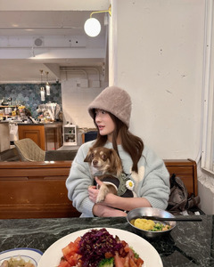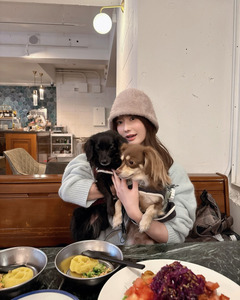 คุณฟูจิโมริโพสต์ภาพถ่ายคู่กับน้องหมาคู่ใจในร้านอาหาร พร้อมแคปชั่นเป็นอิโมจิรูปจานพร้อมส้อมกับมีดและรอยเท้าสุนัข