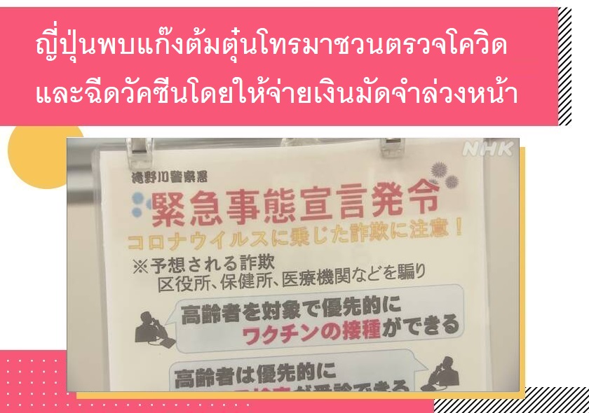 ญี่ปุ่นพบแก๊งต้มตุ๋นโทรมาชวนตรวจโควิดและฉีดวัคซีนโดยให้จ่ายเงินมัดจำล่วงหน้า