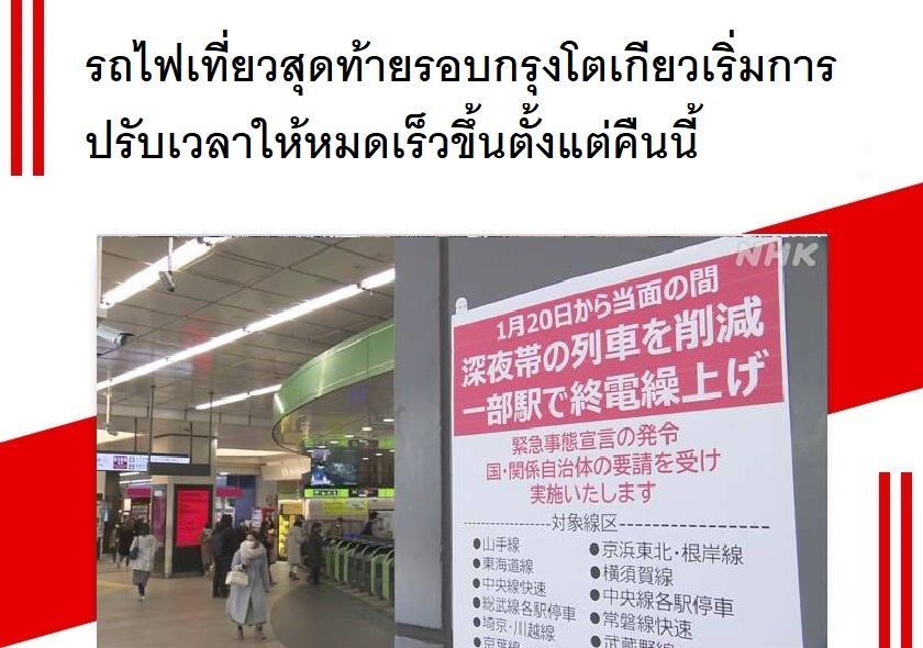 บริษัทรถไฟญี่ปุ่นกว่า 25 แห่งเตรียมปรับเวลาเดินรถของรถไฟเที่ยวสุดท้ายที่ให้บริการในพื้นที่ที่มีการประกาศภาวะฉุกเฉิน ซึ่งได้แก่กรุงโตเกียว คานางาวะ ไซตามะ และชิบะ ให้สุดสิ้นการให้บริการเร็วขึ้นตั้งแต่คืนวันที่ 20 มกราคมนี้เป็นต้นไป ตามนโยบายการประกาศภาวะฉุกเฉินของทางรัฐบาลเนื่องจากการระบาดของโควิด-19