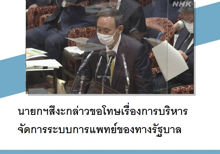 ณ ที่ประชุมคณะกรรมาธิการรัฐสภา วันที่ 26 มกราคม นายสึงะ โยชิฮิเดะ นายกรัฐมนตรีของญี่ปุ่น กล่าวขอโทษที่ทางรัฐบาลไม่สามารถบริหารจัดการระบบการแพทย์ ให้กับประชาชนได้ดีพอในสถานการณ์ที่เชื้อไวรัสโควิด-19 กำลังระบาดใหญ่อยู่ในขณะนี้