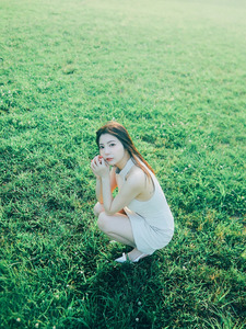 คุณโยชิซาวะโพสต์ภาพกลางวิวธรรมชาติ พร้อมแคปชั่นเป็นอิโมจิรูปใบโคลเวอร์ ตะกร้า และชุดเดรส