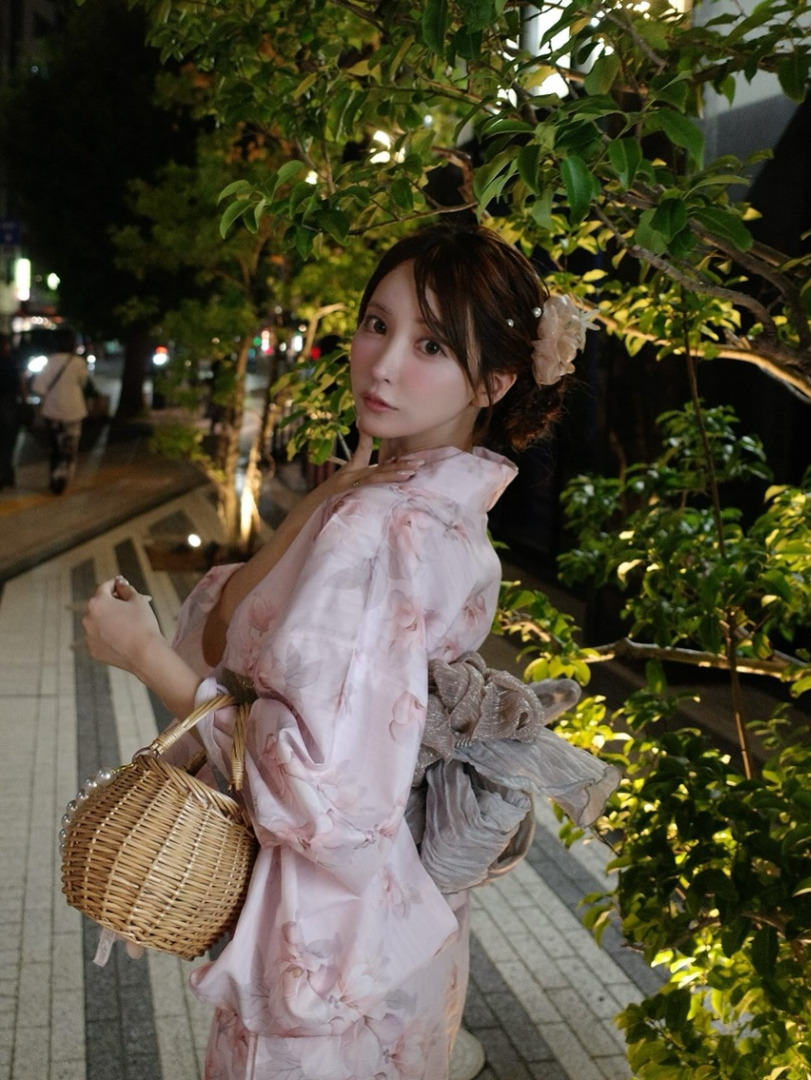 คุณมิคามิโพสต์ภาพในชุดยูกาตะ พร้อมแคปชั่นเป็นอิโมจิรูปเด็กทารกและรูปโบว์