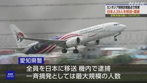 ตำรวจจังหวัดไอจิได้เข้าจับกุมชาวญี่ปุ่น 29 คนในข้อหาพยายามฉ้อโกงบนเครื่องบินเช่าเหมาลำขณะกำลังส่งตัวกลับประเทศญี่ปุ่นเมื่อวันที่ 20 สิงหาคมที่ผ่านมา หลังจากที่บุคคลเหล่านี้ถูกควบคุมตัวในฐานะแก๊งคอลเซ็นเตอร์ในประเทศกัมพูชา ตำรวจมีแผนจะเริ่มทำการสอบสวนอย่างเต็มรูปแบบเพื่อคลี่คลายเครือข่ายองค์กรอาชญากรรมข้ามชาติ