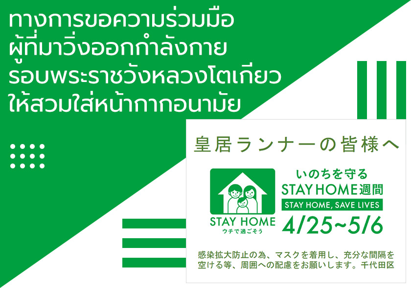 และในกรณีที่ต้องการมาวิ่งออกกำลังกายเป็นหมู่คณะรอบพระราชวังหลวงโตเกียวจำเป็นต้องขออนุญาตจากทางเจ้าหน้าที่ที่ดูแลก่อน แต่เนื่องจากเจ้าหน้าที่หยุดทำการตั้งแต่วันที่ 23 เมษายนเป็นต้นมา จึงได้ขอความร่วมมือพยายามอย่าวิ่งกันเป็นหมู่คณะ