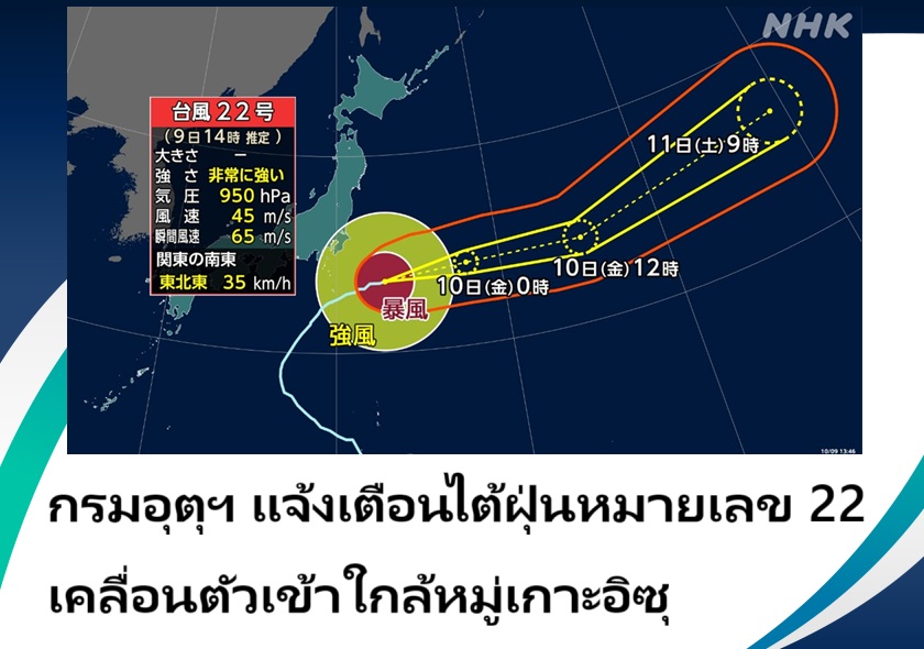 กรมอุตุฯ แจ้งเตือนไต้ฝุ่นหมายเลข 22 เคลื่อนตัวเข้าใกล้หมู่เกาะอิซุ