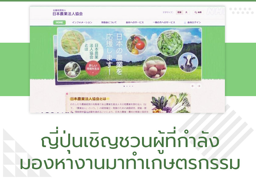 ด้วยเหตุนี้หน่วยงานทางด้านเกษตรกรรมจึงได้จัดทำเว็บไซต์ "สมาคมเกษตรกรญี่ปุ่น" ขึ้นมา เพื่อหวังเชิญชวนผู้ที่มีความสนใจในงานด้านเกษตรกรรมมาร่วมงานด้วยกัน