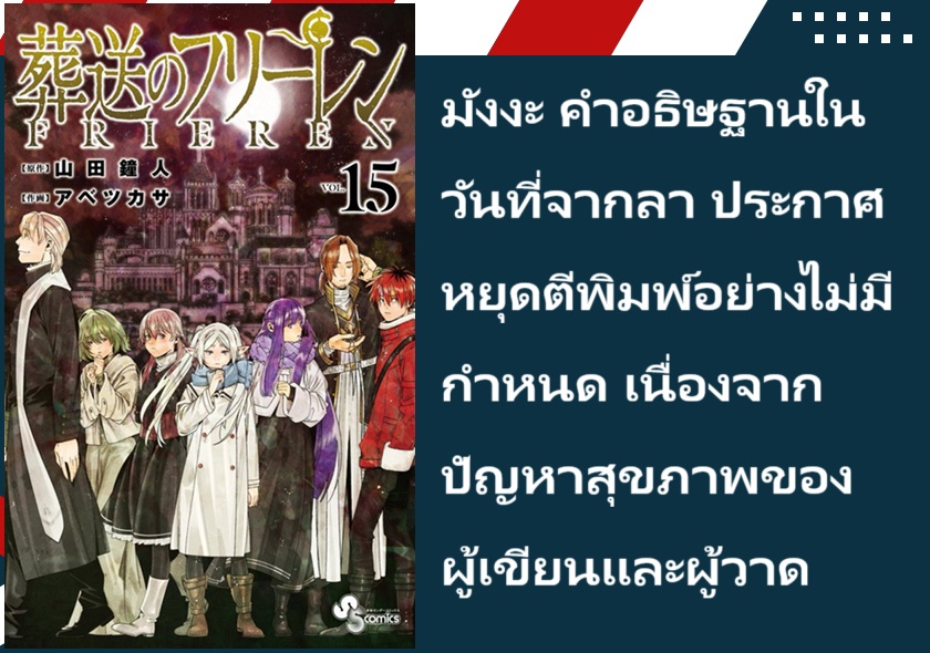 มังงะ คำอธิษฐานในวันที่จากลา (Sousou no Frieren) ประกาศหยุดตีพิมพ์อย่างไม่มีกำหนด เนื่องจากปัญหาสุขภาพของอาจารย์ยามาดะ คาเนฮิโตะ (Yamada Kanehito) ซึ่งเป็นผู้เขียน และอาจารย์อาเบะ สึคาสะ (Abe Tsukasa) ซึ่งเป็นผู้วาด