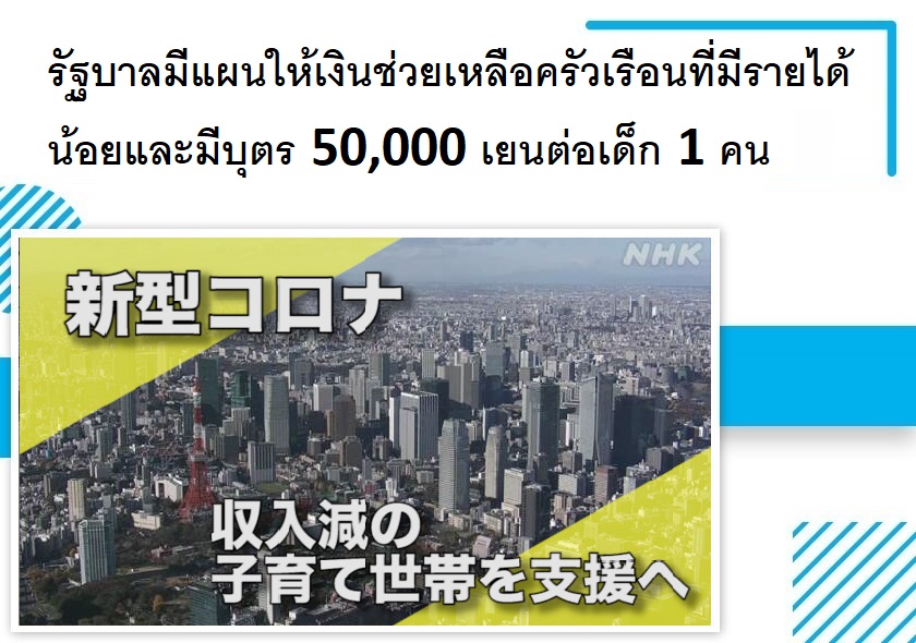 รัฐบาลญี่ปุ่นได้มีนโยบายที่จะให้เงินช่วยเหลือกับทางครัวเรือนต่างๆ ที่กำลังประสบปัญหาทางด้านการเงินท่ามกลางสถานการณ์การระบาดของโควิด-19 ในปัจจุบัน