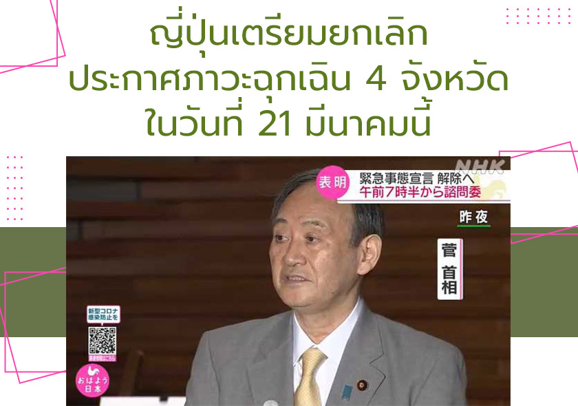 นายสึงะ โยชิฮิเดะ นายกรัฐมนตรีญี่ปุ่นเตรียมยกเลิกประกาศภาวะฉุกเฉินใน 4 จังหวัด ได้แก่ โตเกียว ไซตามะ ชิบะ และคานางาวะ ในวันที่ 21 มีนาคมนี้ โดยจะตัดสินใจเกี่ยวกับเรื่องนี้อย่างเป็นทางการในวันที่ 18 มีนาคมนี้ หลังจากรับฟังความคิดเห็นจากผู้เชี่ยวชาญด้านโรคติดต่อ