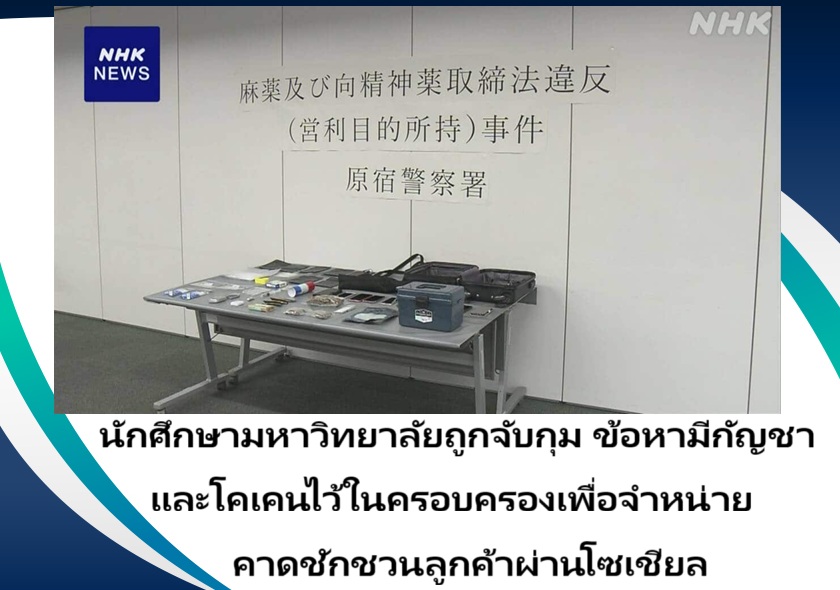 นักศึกษามหาวิทยาลัยในโอซาก้าถูกจับกุมในข้อหาละเมิดกฎหมายควบคุมยาเสพติด เนื่องจากต้องสงสัยว่ามีกัญชาและโคเคนไว้ในครอบครองเพื่อจำหน่าย โดยเจ้าหน้าที่ได้ยึดของกลางเป็นชิ้นส่วนพืชที่คาดว่าเป็นกัญชาและอื่นๆ รวมน้ำหนักกว่า 3.3 กิโลกรัมจากบ้านพักของผู้ต้องหา กรมตำรวจนครบาลโตเกียว กำลังสืบสวนโดยเชื่อว่ามีการลักลอบจำหน่ายยาเสพติดซ้ำๆ ด้วยการชักชวนลูกค้าผ่านทางทางโซเชียล