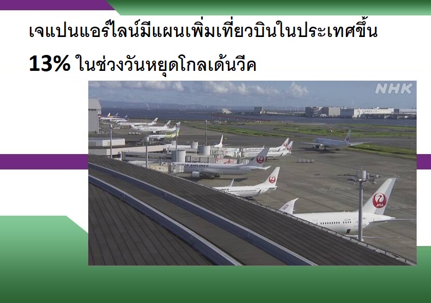 สายการบินเจแปนแอร์ไลน์หรือ JAL ได้มีแผนเพิ่มจำนวนเที่ยวบินในประเทศขึ้นอีก 13% ในช่วงวันหยุดโกลเด้นวีคซึ่งเป็นวันหยุดยาวของญี่ปุ่นตั้งแต่เดือนเมษายนถุงเดือนพฤษภาคม โดยการคาดการณ์ว่าอุปสงค์ในการเดินทางด้วยเครื่องบินอาจฟื้นตัวขึ้น