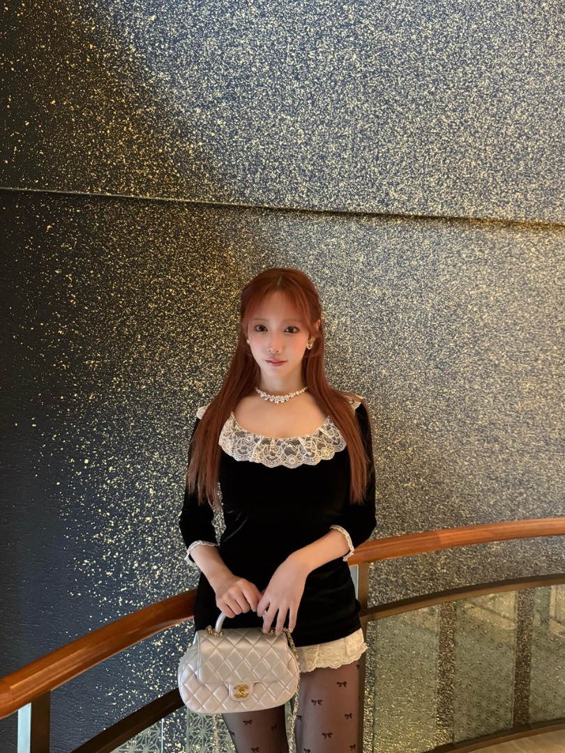 คุณโคโยอิโพสต์ภาพลุคแฟชั่นสวยละมุน พร้อมแคปชั่นเป็นอิโมจิรูปแมวดำ หัวใจสีขาว และปีก