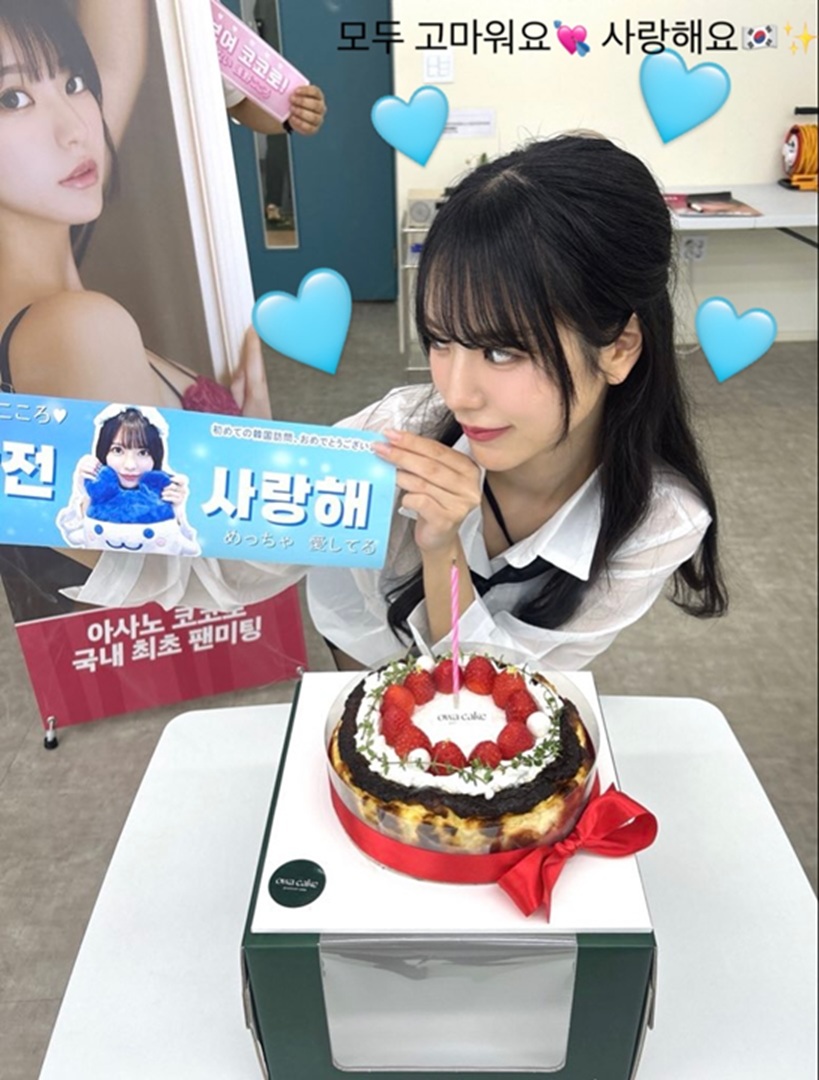 ในโพสต์ 2 คุณอาซาโนะโพสต์ภาพถือเค้ก พร้อมแคปชั่นเป็นอิโมจิรูปเค้กและหัวใจสีฟ้า