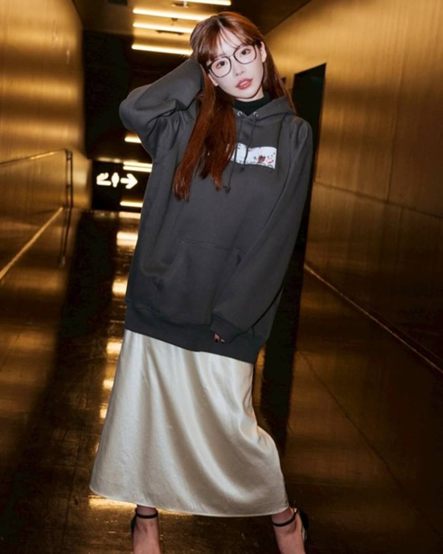 คุณฟุคาดะโพสต์ภาพลุคสาวแว่นกับเสื้อฮู้ด พร้อมแคปชั่นว่า "ตัวฉันที่ใส่เสื้อฮู้ดเป็นไงมั่ง?"