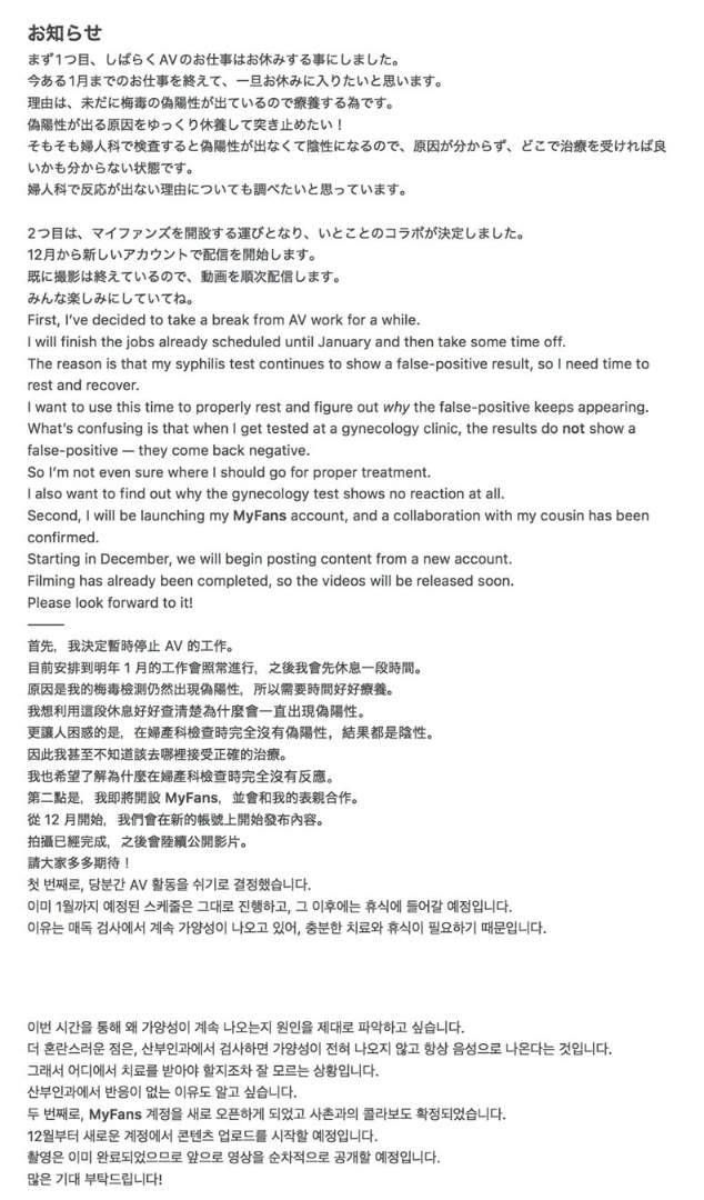 คุณมุโตะ อายากะ (Mutou Ayaka) นางเอก AV ชื่อดังวัย 43 ปี ได้ออกมาประกาศพักงานชั่วคราว เพื่อพักฟื้นและเร่งหาสาเหตุหลังตรวจเชื้อ "ซิฟิลิส" แล้วพบ "ผลบวกปลอม" (False Positive)*