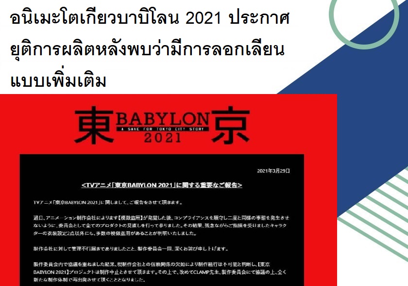 อนิเมะโตเกียวบาบิโลน 2021 ประกาศยุติการผลิตหลังพบว่ามีการลอกเลียนแบบเพิ่มเติม