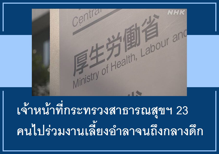 เจ้าหน้าที่กระทรวงสาธารณสุข แรงงาน และสวัสดิการของญี่ปุ่นจำนวน 23 คนได้จัดงานเลี้ยงอำลาขึ้นที่ร้านอาหารแห่งหนึ่งในกรุงโตเกียว เมื่อวันที่ 24 มีนาคมที่ผ่านมา โดยมีเจ้าหน้าที่บางส่วนที่กินดื่มในงานเลี้ยงจนถึงเวลาเที่ยงคืน