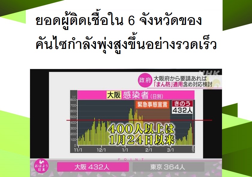 ยอดผู้ติดเชื้อใน 6 จังหวัดของคันไซกำลังพุ่งสูงขึ้นอย่างรวดเร็ว โดยเฉพาะในจังหวัดโอซาก้าที่มียอดผู้ติดเชื้อทะลุเกิน 400 คนอีกครั้งนับตั้งแต่เมื่อวันที่ 24 มกราคม