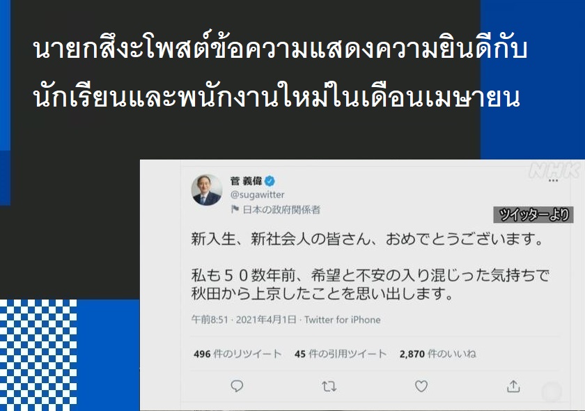 นายสึงะ โยชิฮิเดะ นายกรัฐมนตรีญี่ปุ่น โพสต์ข้อความผ่านทางทวิตเตอร์ส่วนตัวของตนเพื่อแสดงความยินดีกับนักเรียน นักศึกษา และพนักงานใหม่ในวันที่ 1 เมษายน ซึ่งเป็นวันแรกของปีการศึกษาและการเริ่มทำงานของผู้คนจำนวนมากในญี่ปุ่น